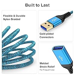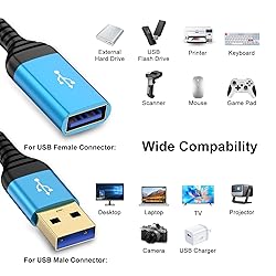 - USB Extension Cable USB 3.0 Extension Cord Type A Male to A Female Nylon Braided Jacket Fast charging and data transmission 2 in 1 the charging speed is up to 2A (fast charging speed) data transfer rate up to 5 Gbps, is 10x faster than USB 2.0 Bend Free & Tangle Free Nylon braided material is more flexible and tangle-free, ensures a more durable and longer lifespan. Extreme Durability & Reliable The combination of corrosion-resistant nickel plated connectors and aluminum alloy case provides superior performance and error-free data transmission. Just Plug and Play A perfect accessory to extend your existing USB cables, solves your problems when you feel helpless caused by your original short cable. 10 Feet Perfect Length With the long USB extension cable, you can play the game far away from the TV to protect your eyes, especially children’s eye health. Universal Compatibility Compatible with All USB A Devices: PC, laptop, tablet, Macbook Phone, iPhone, lights, microphone Webcam, camera, dashcam, USB hub, Mouse, keyboard, Printer, scanner, hard drives, flash drives Wifi adapter, Headset, headphones, Oculus, PS4, VR headsets, Xbox, controller.