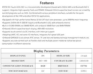 - Features ESP32-S3 Development Board with 2.8inch Round Display. Onboard 2.8inch LCD display, 480×480 resolution, IPS Display Panel, excellent display performance, 160° viewing angle. ( This version without touch function) Equipped with high-performance Xtensa 32-bit LX7 dual-core processor, up to 240MHz main frequency. Supports 2.4GHz Wi-Fi (802.81 b/g/n) and Bluetooth 5 (LE), with onboard antenna. Built-in 512KB SRAM and 384KB ROM, with onboard 16MB Flash and 8MB PSRAM. Adapting UART, I2C and some IO interfaces, integrates full-speed USB port. Onboard QMI8658 6-axis sensor, RTC sensor, TF card slot and battery recharge management module, etc. Supports accurate control such as flexible clock and multiple power modes to realize low power consumption in different scenarios. Supports multiple peripherals. Supports the expansion of multiple peripherals via GPIO, UART and I2C interfaces, etc. Comes with Online Tutorial Usage Guide and Online Development Resource, Please check: n9.cl/fbx54c Package Content ESP32-S3-LCD-2.8C x1 SH1.0 12PIN cable ~100mm ×1 SH1.0 4PIN cable ~100mm (2pcs) ×1