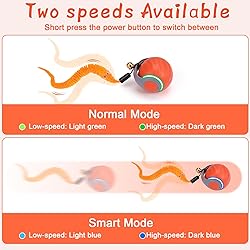 A NEW CHOICE FOR INDOOR ENTERTAINMENT: Endless fun for your cat! Designed for indoor environments, this interactive toy ball rolls quickly across the carpet and emits an appealing cat-attracting chittering sound. Not only does it stimulate your cat's hunting instincts, it also allows them to enjoy outdoor chasing indoors while reducing the risk of furniture scratching INTELLIGENT INTERACTION AND FUN: This automatic cat toy is your pet's new playmate. It has two modes: ① Normal mode (green light), which runs for five minutes and then automatically shuts off. ② Intelligent mode (blue light), after running for five minutes the exercise ball automatically enters the dormant mode, when your cat touches it again, the exerciser will interact with your cat again. So whether it's a long game or a short interaction, this interactive cat ball meets the needs of both you and your pet, allowing your pet to entertain itself while you're busy TWO SPEEDS FREELY SWITCHING: The BABORUI interactive cat toy offers two speeds, fast and slow, which can be freely switched at any time. Even if your cat is cute and short-legged, it can still keep up with the pace of the exercise ball TRIPLE FUN, TRIPLE HAPPINESS: This cat toys for indoor cats comes with three fun tails that provide your cat with triple the fun. They can have endless fun chasing and catching the ball, while the sound of the bells on the tails will further stimulate their curiosity and desire to chase SAFE MATERIAL, LASTING AND DURABLE: We understand that your pet's safety is of utmost importance to you. The shell of this kitten toys is made of safe silicone material, so you don't need to worry even if your pet chews it. The durable design means it can withstand daily wear and tear, providing long-lasting companionship for you and your pet