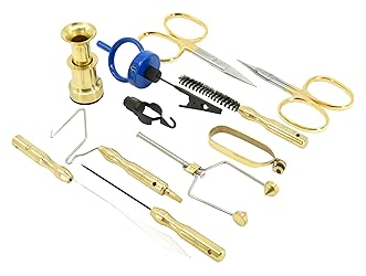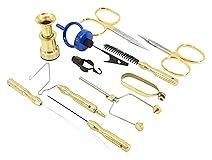 Comprehensive Fly Tying Tool Kit, with Case, Scissors, Bobbin, Bodkin, Whip Finisher, Hackle Plier, Hair Stacker 11 Piece, Brass