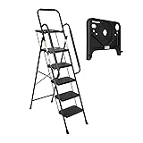 • Built for strength, safety, and convenience, our kitchen ladder is designed to support up to 800 lbs with reinforced construction, offering unmatched stability and durability. Whether tackling home improvement projects, accessing high shelves, or handling maintenance tasks, this step ladder 5 step folding ensures reliable performance for years to come. Designed with your safety in mind, this step stool for adults features a secure handgrip and wide, textured anti-slip steps to minimize the risk of slipping or losing balance. The large rubber feet make full contact with the ground, ensuring a firm grip while also protecting your floors from scratches. The sturdy, well-balanced frame allows you to step up with confidence, knowing you’re supported by a reliable structure. When not in use, the closet ladder folds into a slim profile, making it easy to store in closets, garages, or under furniture. Its lightweight yet durable construction allows for effortless portability, ensuring you always have access to a tall step stool whenever needed. Engineered to meet ANSI safety and performance standards, this closet step stool has been rigorously tested to ensure dependable strength and stability. Whether for home, office, or professional use, it provides a secure and reliable solution for various tasks. Designed for versatility, this step foldable ladder is perfect for home projects, kitchen tasks, painting, office organization, and garage storage. Its durable and stable design enhances safety while making everyday activities more convenient and efficient.