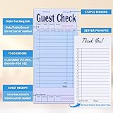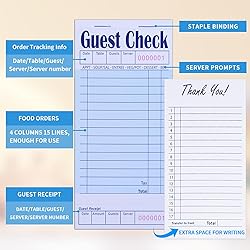 [Great Value Pack]: You will receive 60 blue servers guest checkbooks bulk,with 50 sheets per book, you will receive a total of 3000 server paper sheets. The paper checkbook measures 6.75" x 3.5". The perforated stub measures: 3.5" x 0.75". The right size fits into a standard apron pocket and server booklet, with bottom receipt,making it easy for you to conveniently handle serving and billing. [Efficient Office]: This is a numbered server note pad. Each paper check has a unique serial number printed on the top, which is numbered in sequence to avoid handwriting errors. The top bar also has the date, table number, number of guests, and order details, which can be used to easily control the order. Contains reminders for appetizers, soup or salad, main course, vegetables or potatoes, dessert and drinks, which is convenient for reminding waiters about each step of the meal. [High Quality]: Our guest check server notepad is made of 110gsm thick paper material. The paper thickness is moderate, no need to worry about ink penetration and smudges. The whole page is well laid out, the printing is clear, and both sides can be easily written, with enough space to record longer orders. The reserved part of each guest bill will be printed with the words "THANK YOU" on the back, making customers feel valued. [Easy To Tear]: The top of the restaurant order pad has perforations for quick tearing and handing the order to the kitchen. There are also perforations on the bottom for easy tearing, so you can give a copy of the receipt to the customer or keep it for your own records. It is convenient for you to organize your orders, and is very suitable for hotel restaurants, bars, lounges and cafes, etc. [Wide Range Of Uses]: They are office products that help improve efficiency, essential waiters accessories, not only can be used to record important information, create shopping lists, to-do lists, but also help track orders, help with service and settlement. Very suitable for restaurants, food trucks, lounges, hotels, cafes and small businesses, etc.
