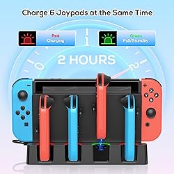 - Elevate your gaming experience with this Switch Joy-con Charging Dock, designed specifically for the Nintendo Switch and compatible with both Joy-Con and OLED controllers. This efficient and user-friendly charger stand station allows you to charge up to 6 Joy-Con controllers simultaneously. With intelligent safety features and an intuitive design, this charging dock is a must-have accessory for any dedicated Nintendo Switch gamer. Keep your gaming setup organized and powered up with this reliable and stylish charging dock!