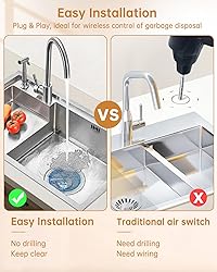 Quick & Easy Installation: Set up your garbage disposal switch in minutes—no wiring, drilling, or electrician required. Simply plug the wireless socket into your outlet, attach the remote switch near your sink (using the magnetic base and tape), and enjoy instant control. Perfect for renters or homeowners who want a hassle-free, tool-free solution Long-Range Wireless Control: Operate your appliance from anywhere in your home with a strong 500-foot RF signal that penetrates walls and cabinets by using remote outlet switch. The anti-interference technology ensures reliable performance, even in large residential buildings or complex layouts Advanced Safety Protection: Garbage disposal button built with multiple safeguards, including surge protection, short-circuit prevention, and overload detection, this system ensures safe operation. The flame-retardant PC housing and smart leakage protection keep your household secure, automatically cutting off power in risky conditions Flexible & Expandable Use: Control multiple appliances with one remote or assign multiple remotes to a single device. Beyond garbage disposals, this system works with lamps, fans, TVs, and more, offering customizable home automation without complicated setups Universal Compatibility: Remote outlet switch works with most standard garbage disposals (15A/1500W, 80V-275V) and common household appliances like coffee makers, toasters, and electric stoves. Always confirm compatibility before purchase