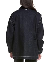- Generously cut workwear jacket in rinsed denim, adorned with multiple pockets and a striking faux pony hair collar. Key features include a relaxed fit, concealed APPARIS silver zipper and snap closure, spread faux pony hair collar, angled welt pockets with flaps, white top stitching, dome snap details, and an Apparis metal charm at the back neck. Crafted from non-stretch rinsed denim and faux pony hair, this jacket is designed for a 5'7" model wearing size small. The jacket is 30 inches in length.