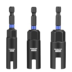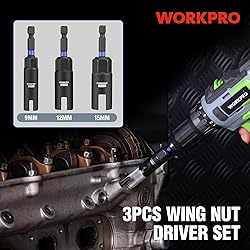 Fast & Safe Operation: This Wing Nut Driver lets you quickly tighten or loosen wing nuts, bolts, and hooks for various projects. It reduces effort and saves time, keeping your work safe and efficient. Specifications: The WORKPRO Wing Nut Socket includes three essential sizes: 9mm, 12mm, and 15mm. Simply attach it to a screwdriver to install wing nuts without straining your fingers. Quick-Size Identification: Easily identify the correct size with our color-coded system. This design speeds up wing nut tool selection, reduces errors, and improves overall work efficiency. Universal Application: Our Wing Nut Driver Set provides wide versatility. It is perfect for tightening or loosening wing nuts and eye bolts. The set is also suitable for wire twisting, making it ideal for DIY projects and general maintenance. Compatible 1/4'' Hex Shank: The universal 1/4 inch hex shank fits most corded or cordless drills, allowing you to quickly fasten wing nuts, bolts, and hooks up to five times faster than by hand. Please Note: We recommend using around 50 N·m as a mid-range torque to help prevent over-tightening and nut damage