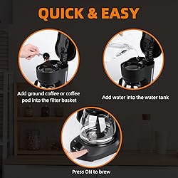 Smart Digital Display - Stay fully informed with a clear screen that shows the clock and brew progress, and enjoy straightforward programmable brewing—all thanks to your coffee maker. 24-Hour Programmable Timer - Engineered for your routine: from scheduling your brew up to a day in advance, to waking up to coffee kept hot for 2 hours, to automatic shut-off for total peace of mind. Discover it all in this coffee machine. Never wait for a full pot -These coffee makers let you grab a cup mid-brew with their Pause & Serve function, so you enjoy fresh coffee without the wait. Clear View Water Window - These coffee machines are equipped with a clear water window for precise measurement at a glance, ensuring perfectly brewed results every time. Truly Easy Cleanup - This coffee pot's removable filter basket and dishwasher-safe carafe leave no hard-to-clean corners. Just enjoy your coffee.