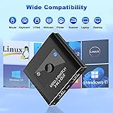 【USB Switch】Easily share USB devices between two computers with our USB 3.0 2-in 2-out switch. Designed for convenience and efficiency, this USB 3.0 switch allows you to share two USB devices between two computers. Whether you are managing printers, scanners, or other USB devices, this switch allows you to do it easily and quickly. (Note: USB Switch will always stay connected when only one computer is turned on) 【USB Switcher 2 Computers】This USB 3.0 switch allows you to seamlessly share up to two USB devices (such as a keyboard, mouse, printer, or external hard drives) between two computers. Perfect for home offices, workstations, or dual-PC setups, this switch makes multitasking easy and efficient. (NOTE: This package comes with two high-quality USB A to A cables, ensuring you have everything you need to get started right away.) 【High-Speed USB 3.0】Featuring USB 3.0 kvm switch technology, you’ll enjoy fast data transfer speeds up to 5Gbps, ensuring quick and reliable performance. The switch is also backward compatible with USB 2.0 and USB 1.1 devices, making it versatile for various setups. 【One-Click Switching for Convenience】The LED indicator lights provide a clear indication of which device is currently active, making operation intuitive and straightforward. Simply plug in the switch and enjoy hassle-free operation across for Windows, Mac, and Linux systems. 【Wide Compatibility】Optimize your workspace and improve your efficiency with our USB Switcher 2 in 2 Out(2 Computer Share 2 USB devices), and experience seamless device sharing like never before. 【Plug & Play】Our USB switch is truly plug and play. With no drivers needed, you can Switch between two connected computers with the push of a button. No need to unplug and re-plug cables, making this switch ultra-convenient for fast transitions. 【No Worry to Buy】 The USB switcher 2 computers comes with 12 months after-sales service and 24 hour online technical support. If the USB switcher does not work properly for you, please feel free to contact us.
