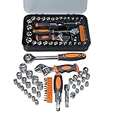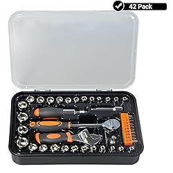 COMPREHENSIVE : This all-in-one toolkit includes 42 essential pieces, such as socket 1/4 Drive Metric 4mm、4.5mm、5mm、5.5mm、6mm、7mm、8mm、9mm、10mm、11mm 、12mm、13mm. 3/8 Drive Metric 14mm、15mm、16mm、17mm & 5/32"、3/16"、7/32"、1/4"、9/32"、5/16"、11/32"、3/8"、7/16"、15/32"、1/2", 1/4 adaptors and extensions, wrenches, mini ratchet angle screwdriver and bit, Making it perfect for a wide range of automotive, home repair, and mechanical tasks STURDY CONSTRUCTION: Crafted from high-quality carbon steel, the sockets and wrenches are built to withstand heavy use, providing exceptional strength, corrosion resistance, and long-lasting performance UNIVERSAL DRIVE COMPATIBILITY: The set features both 1/4” and 3/8” drive sizes, ensuring compatibility with most hand tools and power tools, making it versatile for various applications EASY ORGANIZATION: Included is a sturdy, portable storage case that keeps all pieces securely organized and easily accessible, saving you time and effort on the job site or in the workshop COMFORT AND PRECISION: The ratchet wrench and screwdriver bits are designed with ergonomic handles for a comfortable grip, reducing hand fatigue and allowing for precise control during use