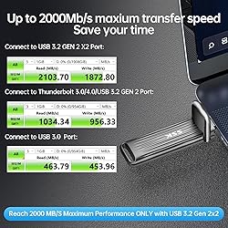 Maxium Ultra Fast Speed up to 20Gbps:Equipped with USB 3.2 Gen 2x2 (20Gbps) and NVMe protocol,SSK usb c flash drive 2tb delivers 2000MB/s read and 1800MB/s write speeds which is 20x faster than standard usb pendrive.Our SSD USB C thumb drive 2tb suit for transferring large 4K videos, games, or design files in seconds. Note:Reach 2000 MB/S Maximum Performance ONLY with USB 3.2 Gen 2x2.USB 3.2 and Thunderbolt 3.0/4.0 limited to 10Gbps, USB 3.0 limited to 5Gbps Speed & Requirements: USB-C drive 2TB achieves speeds of up to 2000MB/s via USB 3.2 Gen 2x2 (20Gbps), quite suitable for 4K/8K video, large files, and high-performance workflows.Backward compatible with USB 3.2 Gen 2/Thunderbolt 3.0/4.0(10Gbps, up to 1000MB/s) and USB 3.0 (5Gbps, up to 500MB/s) Plug and Play: SSK USB C memory stick 2TB supports plug and play, without any software installation. Our Portable External SSD drive can expand the capacity of phones and computers. Massive 1TB capacity in a compact,USB thumb-sized design. Take your files anywhere for travel, work, study,game expansion or expanding device storage on the go Sturdy and Reliable:External ssd hard drive supports OTG functionality,compatible with major OS systems.Premium zinc alloy body resists scratches and drops,ssd flash drive has excellent shock resistance and fast heat dissipation performance to better protect your data.Memoria usb 2tb also comes with a leather case and convenient keyring hole design, you can hang the external usb c ssd stick on a key chain(USB KEY ring is not included) for your portable carry Portable&Light weight: External solid state drives weigh only 58g and measure 2.96" x 0.86" x 0.34".Our 4K ProRes HDR Ready SSD supports 10min Continuous Capture Record.4K60 ProRes straight to SSK USB SSD, which is only available for iPhone 15 Pro/Pro Max, 16 Pro/Pro Max.Take this memoria usb 1tb with you wherever you go, which makes your life easier. An advanced business portable usb ssd drive can record your life and work at any time Universal Compatibility: High speed usb 3.2 flash drive compatible with computer equipment, tablets, Android phones, iPhone 15/16 pro max, iPad, Laptops, Macbook and more. This fast gaming external ssd is compatible with Thunderbolt 3.0/4.0 by 10GBPS speed, comes with default format EXFAT, it works with most systems such as Windows/Linux/Mac OS/iPadOS/Android(Incompatible with lightning port)
