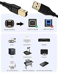 - Features: Gold-plated connectors USB-A to USB-B Port Male to Male connection Available in 3/6/10/20 Foot lengths Black color 1 Pack Compatible with HP, Canon, Epson, Dell, Brother, Lexmark, Xerox, Samsung, and other devices like pianos, DACs, and more, to connect to a laptop or computer (Mac/PC) or other USB-enabled devices. Compatible Devices: HP: Deskjet: 2540, 3630, 2132, 2130, 3520, 3720, 2542, 3636, 2544, 3050A OfficeJet: 5740, 3831, 4658, 6600, 4500, 4650, 4620, 3830 Envy: 4527, 4520, 4523, 5546, 7640, 5530, 5540, 4524, 5544 Photosmart: 5520, 5510, 6520 LaserJet Pro: M15w, MFP M28w, MFP M227fdw, M404n, M507dn OfficeJet Pro: 9015, 8025e, 3830, 5255, 7740 Canon: Pixma: MG2520, MG3550, MG3650, MG4250, MG5220, MG5550, MG5750, MG3620, TR4520, TS5320, MX492, G6020 i-SENSYS: LBP6030w, LBP6200d, MF8280Cw Epson: Stylus: SX130, SX235w, SX400, SX515w WorkForce: WF-2540, WF-2650, WF-2660, WF-2750, WF-3520, WF-3540, WF-3620, WF-2630, WF-3640, WF-2850, WF-2860, WF-4820, WF-7710, WF-7210 : ET-2720, ET-3760, ET-4760, ET-M2170, ET-15000 Brother: MFC: MFC-1910w, MFC-9330cdw, DCP-195c, DCPl-7055, DCP-l2520DW HL: HL-l8250CDN, MFC-9330cdw, Hl-l2300D, DCP-195c, DCPl-7055, DCP-l2520DW Lexmark: X4650, X5650, CS317dn, CX510de, MS317dn, MX310dn, CX310n, MS711dn Samsung: CLX-3305FN, CLX-3175FW, ML-1010, ML-1200, ML-1250 Xpress: M2070W, SL-M2020W, SL-M2070FW, SL-M2835DW, SL-C480FW Oki: ML1120, C5650dn, C301dn, MC362dn, MC563dn Other: Yamaha digital piano, DAC, and more. Important Notes: Verify your device has a Type B Female port, not a standard USB, Micro-USB, or Mini-USB port. This printer/scanner cable is mainly used for data transfer and cannot be used as a power cable to power on the printer.