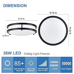 【Dimmable & 5CCT】Our flush mount led ceiling light provides 5 color temperature options(3000K/3500K/4000K/5000K/6000K) and is compatible with most standard dimmers (Dimmers not included). You can choose your preferred color temperature and brightness for various spaces. 【Modern Design & Wide Application】Our LED Ceiling Lights feature a clean, stylish design that matches most styles of interior furnishing, and are perfect for kitchens, bedrooms, closets, living rooms, washrooms, etc. Providing energetic, clean lighting to your living environment. 【CRI85+ & Large Illuminated Area】The LED ceiling light fixtures have a CRI85+ rating, which allows the light to render more closely to the object’s true and original color, illuminating a 15m2—20m2(150-220sq.ft) area of your home. 【Energy-saving & Super Bright】 Built-in LED light so there is no need for an extra bulb. The output brightness of a 18W LED ceiling light is equivalent to a traditional 170W incandescent ceiling lamp, saving you up to 85% in energy costs. Bringing less power consumption and higher brightness to you. 【Satisfaction Guaranteed Warranty】We focus on improving the shopping experience for our customers. If you are not satisfied with our products, please feel free to contact us.