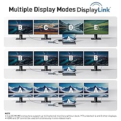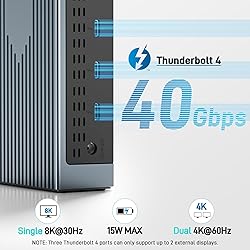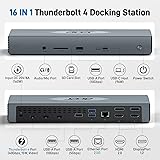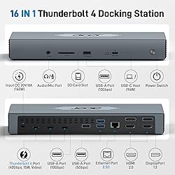 【16-in-1 Full-Feature Thunderbolt 4 Dock】This thunderbolt 4 dock is equipped with 3×Thunderbolt 4 (8K@30Hz & 40Gbps), 2×HDMI (4K@60Hz), 2×DisplayPort (4K@60Hz), 2×USB-A (10Gbps), 2×USB-A (5Gbps), 2.5G Ethernet, SD4.0 (312MB/s), audio/mic port, USB-C Host (PD 96W), and an Input 160W DC power port — offering high performance and versatile connectivity to meet all your needs. 📌𝐍ote: 𝐏lease download the latest 𝐃isplay𝐋ink driver before using the dock. 【Single 8K or Quad 4K@60Hz Display】The thunderbolt 4 docking station supports a single 8K@30Hz display or up to four 4K@60Hz displays. 📌𝐍ote: 𝐄nsure your laptop supports 𝐃𝐏 𝐀lt 𝐌ode and has sufficient bandwidth for four 𝟒𝐊@𝟔𝟎𝐇z monitors; otherwise, display performance may be reduced. 【Fast 40Gbps Data Transfer】The Thunderbolt 4 Dock features three Thunderbolt 4 ports supporting ultra-fast 40Gbps data transfer, allowing you to move large files in seconds. It also includes 2×USB-A 3.2 (10Gbps) and 2×USB-A 3.0 (5Gbps) ports for versatile connectivity, while the built-in SD 4.0 card reader offers transfer speeds up to 312MB/s for even greater flexibility. 【160W Super Power Adapter】The laptop docking station comes with a powerful 160W adapter, delivering reliable power for any Thunderbolt or USB-C host device. The USB-C host port provides up to 96W PD to charge the connected laptop (host device) only. 📌Note: Ensure your laptop’s USB-C port supports the PD protocol to enable high-speed charging.📌Note: The dock requires re-press the power button to restart after a power loss. 【2.5 Gigabit Ethernet】The Thunderbolt Dock features a 2.5Gbps Ethernet (RJ45) port for a stable, ultra-fast wired network connection, backward compatible with 1Gbps and 100Mbps devices. It also includes a 3.5mm audio/microphone jack for easy connection to headphones or mics, ensuring crystal-clear communication and rich, immersive sound quality. 【Perfect Displaylink Dock for MacBook Users】The Thunderbolt 4 Docking Station with a built-in DisplayLink chip is an excellent choice for MacBook users who need extended screen capability. It supports MST mode on macOS, allowing multiple external displays without limitations. To enable full multi-display functionality, please install the official DisplayLink driver. 📌Note: Only M1/M2 Max or newer Mac models support up to 5 displays (laptop + 4 external monitors).