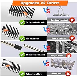 Our thatch rake’s tines are upgraded reinforced carbon steel—Heavy duty, deformation-resistant, and coated with anti-corrosion protection to prevent rust. The thickened stainless steel handle is double-reinforced, so it won’t bend or break even with heavy, repeated use. Every threaded connection is deepened and locked tight, staying secure no matter how hard you work. Designed with 13 curved tines + 16 straight tines, this multi-functional dethatcher rake crushes every task. It quickly removes thatch, weeds, and dead leaves, loosens hard soil effortlessly, and even simplifies turf laying. By clearing debris and aerating soil, it helps your grass and plants get more air, sunlight, and nutrients—making it a must-have for maintaining a lush lawn, vibrant garden, or neat landscape. Save time and effort with one tool that does it all! Forget complicated setup! The rake head comes pre-assembled—just attach the handle sections (no extra tools needed) and youre ready to go. With 3 adjustable lengths (31”, 44”, 57”), it fits users of all heights perfectly. When youre done, disassemble the handle into small sections for easy storage—no more bulky tools taking up space in your garage or shed. Practical, convenient, and designed for real-life use. Adjustable Lengths: 31”, 44”, 57” (fits all heights) Rake Width: 15” (covers more ground fast) Tine Configuration: 13 curved + 16 straight (max efficiency) Bonus Inclusions: 1 pair of protective gloves + installation wrench Every detail is thought out to make your lawn care easier—right down to the free gloves that keep your hands safe from scratches. We stand behind our product 100%. If you have any questions or issues, our customer support team is here to help with fast, professional solutions. Not satisfied? No problem—we offer a no-questions-asked refund. Just follow basic safety guidelines during assembly and use to avoid injuries, and enjoy peace of mind knowing youre covered.