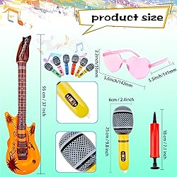- Widely Application: These inflatable rock toys are perfect for any gatherings and parties, and the lovely inflatable instruments are the best props for successful music theme activities, which can be used as birthday party props, concert stage props, classroom party props, performance props, etc Specification: Size: inflatable guitar : 55 cm / 21.6 inch inflatable microphone: 25 cm/ 9.8 inch heart shaped sunglasses: 14 x 14.4 cm/ 5.5 x 5.6 inch Material: inflatable guitar: PVC inflatable microphone: PVC heart shaped sunglasses: plastic air pump: plastic Color: multicolor Quantity: 56 Pcs Package include: 18 x blow up guitars 18 x inflatable microphones 18 x heart shaped sunglasses 2 x air pump Note: Suit for child 12 years and up