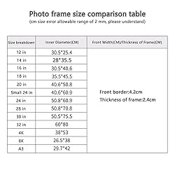 - Product Description: Product name: Simple photo frame Product size: 12 in , 14 in , 16 in , 18 in , 20 in , Small 24 in , 24 in , 28 in , 30 in , 32 in , 4K , 8K , A3 Suitable for: living room, dining room, study, bedroom Package Includes: 1pc photo frame Note: Due to different monitors may appear color difference, please understand.
