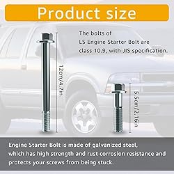 LS Engine Starter Bolt Kit: The LS Engine Starter Bolt Kit is suitable for all general Chevrolet 1997-2014 LS series engines Bolt Specifications: The bolts of LS Engine Starter Bolt are class 10.9, Long bolt measures 4.69" - Short bolt measures 2.14" Product Compatibility: LS Engine Starter Bolt Kit is compatible with all LS series engines. From 1997 to 2014, LS1, LS2, LS3, LS6, LS7, LS9, and GM Vortec 4.8L 5.3L 6.0L 6.2L. It is also suitable for LSX LM7 LR4 LQ4 LQ9 L33 LH6 L92 L76 L99 L96 L82 L83 L84 L86 L87 engine product quality: Engine Starter Bolt is made of galvanized steel, which has high strength and rust corrosion resistance and protects your screws from being stuck Packaging content: Includes 2x long bolts and 1x short bolt