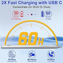 Wide Compatibility: Surface Pen is compatible with a wide range of Microsoft Surface devices, including the Surface Pro 9/10/11/8/X/7/7plus/6/5/4/3、Surface Laptop / Laptop 2 / Laptop 3 / Laptop 4 / Laptop 5、Surface Book / Book 2 / Book 3、Surface GO 1/Surface GO 2、Surface GO 3/GO 4、Surface Studio/Surface Studio 2, and and some models from HP, ASUS, DELL, Acer, SONY and ViewSonic. If you are not sure about compatibility, please contact us and provide the model. Fast Charge & Longer Standby, No Panic: Experience the convenience of our Microsoft surface pro 9 stylus pen with USB-C fast charging. Just 30 minutes of charging provides up to 60 hours of uninterrupted use. This feature outperforms many competitors, making it perfect for creators, professionals, and students who frequently take notes or create art. The surface pro 11 stylus pen also enters sleep mode after 10 minutes of inactivity, conserving battery life. Powerful Magnet Attach, Never Lose Again: With two strong magnets, our windows surface stylus securely attaches to your tablet, ensuring you never lose it. In addition, simply press any button to start writing—no Bluetooth or app setup required! The Surface Stylus features multifunctional buttons, eraser button (long-press to erase errors), right-click (one-click function, also equivalent to the right mouse button), making your workflow seamless and efficient. 4096 Finest Control & Tilt Function: Artists, photographers and designers will love ours Surface Stylus pen. Elevate your creative projects with 4096 levels of pressure sensitivity. Our Stylus Pen recognizes both pressure and tilt, allowing you to create varied line thicknesses effortlessly, the greater the pressure, the thicker the line. The 45mm pen tip mimics the feel of traditional pen strokes, providing a smooth, lag-free drawing experience. Anti Palm Touch Technology: Stylus for Surface Pro incorporates advanced anti-palm rejection technology, letting you rest your hand on the screen while writing or drawing—just like paper! No accidental touches disrupt your work. Enjoy fluid, natural input whether you’re note-taking, sketching, or highlighting.