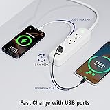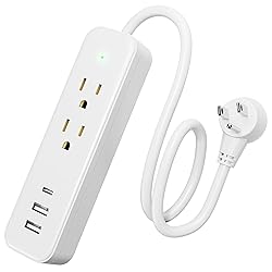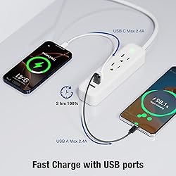 - White Power Strip Surge Protector Flat Plug with USB Ports 5 in 1 small power strip surge protector, featuring 2 AC outlets, 2 USB A ports and 1 USB C fast charge port. You can power up to 5 devices simultaneously with this power strip surge protector, very suitable for your daily life and work power supply needs; Power strip is designed with 1 USB C charging port and 2 USB A charging ports. The USB C charging port features a maximum output of 2.4A, while each USB A charging port also has a maximum output of 2.4A. It can fully charge your smartphone in about 2 hours; Flat plug power strip is designed to snugly fit against the wall for space saving, allowing it to be easily hidden behind furnitures, beds or refrigerators. It's perfect for tight areas, ensuring that your setup remains tidy and organized while providing convenient power access; Wall moutable power strip with 20 inch extension cord, making it easy to place in any location with two mount holes. Ideal for both home and office use, it offers a neat solution for powering multiple devices without taking up valuable space; Surge protector power strip is built with 245 joules of surge protection and is also equipped with overload, overcurrent, and short circuit protection, safeguarding your electronics from harmful voltage spikes and ensuring your devices remain safe and functional; Portable and lightweight travel power strip, travel essential for anyone on the go. Its compact design makes it easy to pack in your luggage, while multiple outlets allow you to charge several devices simultaneously. Perfect for hotels or crowded airports, provides convenience and efficiency for all your charging needs; Multi safety protection, white small power strip is ETL certified and made with fire-resistant shell and 100% pure copper, providing enhanced durability and a longer lifespan, making this power srtip a reliable choice for all your charging needs; Warranty: free replacement with a new flat plug power strip surge protector within 18 months from the date of purchase.