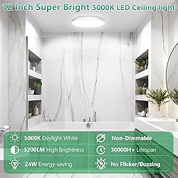 【Super Bright & Energy Saving】Experience an impressive 3200 lumens of illumination with just 24W! Our 12-inch flush mount ceiling lights are equivalent to 240W incandescent bulbs, providing bright lighting for dim corridors and cozy reading corners. Plus, these fixtures can help you reduce your monthly electricity bills by saving up to 90% energy compared to traditional ceiling lamps. Warm reminder: This ceiling light is non-dimmable. 【Ultra-Thin Design】We use cutting-edge materials known for their flexibility and strength to create this incredibly slim modern ceiling light, measuring just 0.67 inches thick. This design surpasses the thickness limitations of traditional close-to-ceiling fixtures. Regardless of your ceiling height, it seamlessly integrates into your home decor, adding a stylish and contemporary touch. 【Safe & Premium Materials】Crafted from high-quality, non-flammable plastic housing, our LED ceiling lights effectively prevent electrical hazards such as electric shock and leakage. Their closed-surface design keeps dust out and is easy to clean—simply wipe them gently. This makes our LED ceiling lights ideal for dusty laundry rooms or damp kitchens. You won’t have to worry about fading, rusting, or corrosion over time. 【Easy Installation】Installing our low profile ceiling lights is a breeze! With the included mounting accessories and step-by-step instructions, you can upgrade your home lighting in just a few minutes. Simply install the back plate, connect the wires, and snap the panel into place—no electrician required. This convenient installation method makes it easy to enhance your stairwells or storage rooms. Moreover, our universal round led lights can adapt to various junction boxes. 【Advanced Eye Comfort Technology】Equipped with premium SMD2835 LED chips, our closet ceiling light delivers uniform, flicker-free 5000K daylight that actively prevents harsh glare. Enjoy comfortable viewing during work, reading, or late-night TV sessions—your family deserves zero-strain illumination! This small ceiling light fixture is perfect for closets, bathrooms, pantries, garages, hallways, basements, bedrooms, stairwells, cloakrooms, and more. 【Buy with Confidence】If you have any questions, we’re here to help! We value your feedback and cherish every opportunity to provide you with a perfect shopping experience. Ensuring customer satisfaction with each purchase has always been and will always remain our top priority.