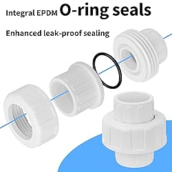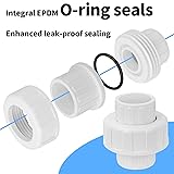 【Size Information】3/4" PVC union pipe fitting – Fit for 11.05 inches/26.67mm OD Pipes, connecting two pipes more easily for future pipe cleaning、repair and replacement. 【Leak-Proof PVC Union】Built-in EPDM O-ring provides sealing to resist oil, water and some solvents. 【Premium Quality】Made of high-quality PVC, ruggedized and corrosion-resistant, long-lasting. 【Wide Application】This SCH40 PVC pipe union is perfect for both indoor and outdoor PVC pipe repairs, as well as outdoor irrigation or sprinkler systems. 【Easy Installation】Using only primer and adhesive, you can install easily, quickly and conveniently.