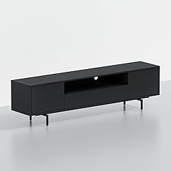 • Elevate your living space with ComfIQ's Norrhaus 75-Inch Modern TV Stand in Black Finish in 20-Inch Height —a striking blend of Scandinavian-inspired design and everyday functionality. Crafted with precision using durable a sophisticated tooless assembly system, furniture-grade MDF, premium melamine veneer, and durable steel, this sleek media console brings clean lines, thoughtful proportions, and a modern silhouette to your entertainment setup. From ease of assembly to usable cabinet space, our designers analyzed optimal materials, construction, and style to develop a stylish TV cabinet that won't break the bank! While many similarly priced cabinets utilize cam-locking technology, the Norrhaus features a latch-locking no-tools assembly system making the assembly of the cabinet frame quick and easy. Simply make a 'male/female' hardware connection, flip the latch to lock the connection in place... and you're done! Additionally, the Norrhaus TV Cabinet sports high-end Euro-style hinges — the same concealed hardware trusted in modern kitchen cabinetry for a clean, streamlined look. While they can be a bit finicky to adjust at first, their 3-way adjustability gives you precise control over the height, depth, and side-to-side positioning of each door. With a little patience and a few tweaks, you’ll achieve flawless alignment and that satisfyingly seamless finish. Please allow 10 to 15 minutes to fine-tune door alignment. The Norrhaus features two concealed storage cabinets, a wide central shelf with built-in cable management, and an elegant floating design supported by sturdy metal legs. Assembly is a breeze thanks to our no-tools technology, so you can go from box to beautiful in minutes. Whether you're hosting a movie night or simply showcasing your style, the Black Norrhaus in 20-inch height is the perfect foundation for modern living.