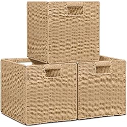 Wicker Storage Baskets for Organizing, 3 Pack Rustic Foldable Square Basket for Shelves, Handwoven Cubby Organizer Bins for Home Decor, Small Cube Storage Bin for Closet Organization (Natural 11 inch)
