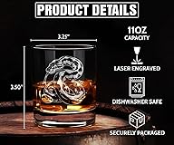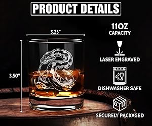 It can hold 11 ounces of bourbon, scotch, cognac or various alcoholic beverages, and can hold 3 5/8 inches in height and 3 inches in diameter Laser-engraved unique design is durable and maintains its premium look for years to come. Chip-resistant rim which makes it durable for long lasting use. Thick heavy base which keeps it sturdy and stable. Perfect for serving whiskey, scotch, bourbon, liquor on the rocks or a variety of delicious cocktails. All of our whiskey glasses are all individually inspected to make sure they are perfect and up to our high standards. The glasses are also hand packed and bubble wrapped for extra security through any delivery. We strive for excellence and expect nothing but the best for our customers!