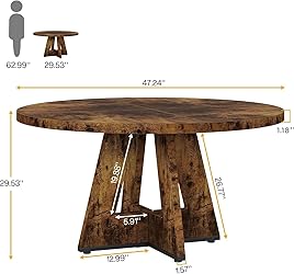 Ample Seating Capacity and Size: With a generous circumference of 47 inches, the Tribesigns Round Dining Table is designed to accommodate up to four adults comfortably. This allows for an intimate and cozy dining experience where everyone can easily engage in conversations, making it perfect for small family get-togethers, date nights or casual dining in both living and dining spaces Farmhouse Style Design: Inspired by the timelessness of farmhouse design, this dinner table showcases a Burlywood finish that exudes a nostalgic rustic charm. The wooden tabletop against the unique cross base that characterizes this table brings a warm and inviting aesthetic that elevates the dining experience, turning ordinary meals into memorable occasions Stable & Durable Dining Table: Say goodbye to wobbly tables and enjoy rock-solid comfort. For the splicing of the 4 tabletop panels, the innovative flat metal connectors is added additionally to the traditional single bolts fixing. Eliminates gaps and loose surfaces for a flawlessly smooth dining experience. Premium durable wood and cross-shaped base combine robust construction with timeless design, and enhances stability, promising to be a mainstay in your home's dining decor for years Versatility and Easy Matching: The harmonious blend of the Burlywood color and the elegant round design make this dining table easily adaptable to different interior designs. It effortlessly complements various décor styles, whether they be rustic, modern, traditional or farmhouse, adding a touch of sophistication to any dining or living area Effortless Assembly: The table comes with detailed, easy-to-follow assembly instructions, ensuring a quick set-up without any professional help. Note that the package includes only the table, offering you the ability to choose chairs that perfectly match your style preference and current décor, allowing a personalized touch to your dining space. The design also facilitates easy maneuvering during setup, promising a fuss-free assembly experience
