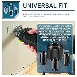 Compatibility: our replacement collet and nut kit works with spiral saws and drywall cut out tools; It is also compatible with DEWALT drywall cut out tools, but it is necessary to confirm the collet size before purchase Replacement Collet and Nut Kit: our replacement collet and nut kit is designed to replace the worn collet and nut on your drywall cut out tools, keeping your tool running at full capacity Quality Materials: our black replacement collet and nut kits are robust and made of quality alloy steel to ensure your tools continue to work efficiently and safely Kit Includes: replacement collet and nut kit includes 3 collets (1/8", 5/32", 1/4") and nut; Meets the needs of most drywall cutting tasks Easy to Install: swapping out the collet and nut is simple and straightforward, taking just a few minutes for quick tool maintenance or adjustment