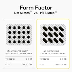PERSONALIZED PERFORMANCE: Fine-tune your mouse feel with modular pill skates—adjust layout and quantity to balance glide and control. Fully customizable for your hand speed, grip style, and aim mechanics. SPEED OR CONTROL: Less contact = more speed. More contact = tighter control. Choose PTFE for slick, fast glide or UHMW-PE for precision and longer wear—ideal for glass mousepads and hybrid surfaces. PTFE SKATES: Same material as Teflon, one of the slickest solid materials, these skates have an incredibly low Friction Coefficient PILL FORM FACTOR: The pill shape provides more control with fewer skates. The larger surface area reduces depression on soft pads which prevents your mouse from bottoming out. UNIVERSAL COMPATIBILITY Designed to fit the majority of mouse shapes, easy to fit and flex to any base layout. Peel and stick with our clean, residue-free adhesive ensuring our skates are fast to install, easy to swap, and all without damaging your mouse.