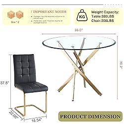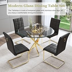 【Modern 5 Piece Dining Table Set】The 5-piece kitchen table set includes 1 round glass dining table and 4 upholstered dining chairs. The modern industrial design of the dining table and chairs has clean lines that will fit well into a variety of décor styles. This tempered glass dining table set is versatile enough to suit any style and complements any dining chair perfectly. 【36" Glass Dining Table】The kitchen table is made of top quality 0.39" thickened tempered glass top and four stainless steel chromed cross legs perfect combination. The glossy clear tabletop not only adds to the table's aesthetic appeal but also makes it easy to clean and maintain. The dining table frame has gold/silver mirror finished, making the dining table look special and stylish. 【Comfortable Dining Chair】The selected high-quality PU faux leather seat and strong C-shaped metal frame of our kitchen chairs are durable and can support up to 250 lbs. Non-slip pads under the chair legs not only provide stability but also prevent scratching of the floor. 【Ideal for Small Space】The glass kitchen table set is an excellent choice for those looking to balance style and practicalit. Perfectly accommodates 2-4 people. The transparent glass table set enhances visual space, suitable for small party or chatting with friends, which makes it a great choice for small spaces dining room apartments. 【User-Friendly Assembly and Quality Assurance】Experience hassle-free setup with comprehensive instructions and all necessary hardware included. The assembly process is designed to be straightforward, ensuring you can enjoy your stylish dining table set without unnecessary complications. Backed by a commitment to quality, this dining table comes with reliable customer support, providing assistance and assurance for a satisfying post-purchase experience.