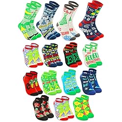 Buddy the Elf Sock Set - Bundle of One Size 15 Pack of Crew and Low Cut Socks Plus Bookmark | Elf Movie Merchandise for Women. The Elf mystery sock set features 15 pairs of socks, showcasing assorted colors and prints from the Elf movie. It includes 4 pairs of crew socks and 11 pairs of low-cut socks. Enjoy the mystery of opening all 15 days of Elf-themed socks and adding to your Elf clothing and merchandise collection, featuring Buddy! Sure to be a hit with classic movie fans, this Elf sock set is an ideal way to count down to Christmas or spice up your wardrobe with 15 unique options for any outfit. Officially licensed Elf advent sock set is perfect for any fan, also includes a bookmark.