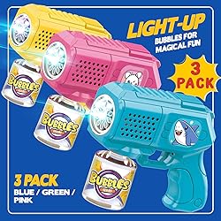 Vibrant Bubbles with Light-Up Fun: This 3-pack bubble gun ensures triple the fun, over 5000 bubbles per minute, illuminated by light-up features that add excitement to every play session Bubble Gun 3 Pack: Included are 3 bubble guns, 3 bottles of bubble solution, and 5 packets of concentrate, providing you with everything needed for endless bubble-blowing adventures Leak-Proof Design for Mess-Free Play: Designed with a leak-proof mechanism, our bubble guns allow for 360-degree rotation without any spills, ensuring a mess-free experience Durable Construction for Long-Lasting Fun: Crafted from sturdy ABS plastic and powered by a reliable motor, our bubble guns are built to withstand countless play sessions Perfect Gift for Kids: Ideal for children aged 3-12 kids. Great for weddings, parks, backyards, and indoor/outdoor play.