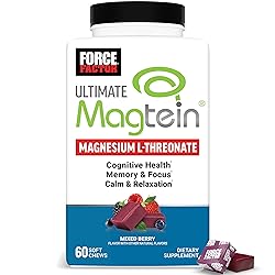 SUPPORT RELAXATION: Ultimate Magtein magnesium L-threonate 2000mg per day promotes total relaxation. This magnesium L-threonate supplement helps you tackle the day with sharper clarity and focus.* BOOST MEMORY & FOCUS: Synaptic connections in the brain decline with age, affecting memory and focus. This magnesium threonate supplement helps restore these connections, improving brain function to support cognitive ability—keeping you sharp as you age.** MAINTAIN COGNITIVE FUNCTION AS YOU AGE: Memory, reasoning, and core cognitive functions peak at 25. Don’t let age-related cognitive decline hold you back. Force Factor Magtein magnesium L- threonate supports memory as well as executive function as you age.** CLINICALLY STUDIED MAGTEIN: Patented Magtein magnesium L-threonate is a powerful, scientifically superior form of magnesium clinically shown to support the brain. It’s highly absorbable and shown to cross the blood-brain barrier for maximum cognitive benefits. DELICIOUS & CONVENIENT: Unlike magnesium L-threonate capsules, Force Factor Ultimate Magtein Soft Chews come in a Mixed Berry flavor you’ll love. Plus, they’re ultra convenient whether you’re on the go, or winding down for bed. In clinical studies, Magtein has been shown to penetrate the blood-brain barrier, Zhang C., et al (2022), improve relaxation and daytime functioning, Hausenblas H.A. (2024), and improve cognitive function in older adults, Liu G. et al (2016).