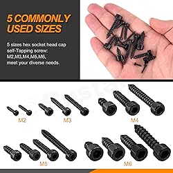 【 What You Get 】 --- You'll receive a 125pcs 16 sizes black hex socket cap head self tapping screws kit with hex wrench. The socket head cap screw come in 16 various sizes, including M2x8mm, M2x10mm, M3x10mm, M3x16mm, M3x20mm, M4x12mm, M4x14mm, M4x20mm, M4x30mm, M5x12mm, M5x20mm, M5x30mm, M6x12mm, M6x16mm, M6x20mm, M6x30mm, in total 120pcs. The kit is equipped with 5 sizes nickle plated hex wrenches, including M1.5, M2.5, M3, M4, M5. Sufficient quantity and rich sizes can meet your different needs in daily life. 【 Durable & Reliable 】 --- These hexagon socket head tapping screws are made of 304 stainless steel with black finish, which are not easy to break,corrosion-resistant, wear resistant, high strength and durable with long-term service life. These tapping screws feature uniform design, excellent oxidation resistance and strong holding performance, which can withstand any bad environment, such as high temperature, cold and high humidity. 【 Provide A Tight Hold 】 --- The socket head cap screw kit has 16 most-used sizes to cover most of your project needs in daily life. And the thread of wood screw is deep, clear and firm, smooth and burr-free, with uniform force, which can prevent the screw from loose and deform in using process. 【 Easy To Use 】 --- The included wrench can help you to install and remove the socket head cap screw easily. The thread of the metric socket head cap screw is clear and firm, smooth and burr-free, easy to insert, and not easy to loosen. Besides, the socket head cap screw in various sizes are packed neatly in a separate compartment in a transparent storage box, making it easy to get the right size you need. 【 Wide Application 】 --- These hex head self tapping screws are widely used in machinery, furniture, car and motorcycle repair, electronic equipment, building, 3D printer projects and other DIY projects. Suitable for joining most woods, boards, kitchen worktops, cupboards,speaker, trumpet, fittings, sports equipment, beds, tables, chairs, and so on.