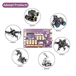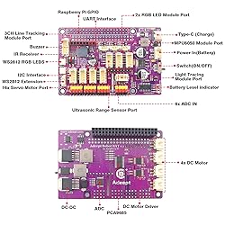 - Adeept Robot HAT for Raspberry Pi is designed for DIY projects and educational needs. The Adeept Robot HAT V3.1 is a motor and sensor driver HAT that supports Raspberry Pi 4 and Pi 3 models. The board features a bunch of headers that give access to sensor and motor controllers including 16 servo motor ports, a 3-CH line tracking sensor, an ultrasonic sensor, IR receivers, WS2812 RGB LEDs, and more. Additionally, the board features an integrated 8.4V battery charger with a USB-C port for charging. All these features make it easy to build DIY robotics and smart car projects with this HAT. Adeept Robot HAT V3.1 is a robot driver board and must be used in conjunction with a Raspberry Pi. Compatible with Raspberry Pi 4B/3B/3B+. With it, you can easily DIY your Raspberry Pi robot and smart car, etc. Adeept Robot HAT V3.1 Specifications: HAT Name – Adeept Robot HAT V3.1Interfaces and PortsRGB LED 2x RGB LED ports2x WS2812 RGB LEDs onboard1x WS2812 extension headerSensor Interface 3-CH Line following sensor portUltrasonic range sensor portMPU6050 6-axis (gyro + accelerometer) portLight tracing sensor portIR receiverMotor Drivers 4x High power DC motor driver16x Servo motor driver with PCA9685Communication 1x UART port for communication and debug1x I2C interface portUSB 1x USB-C port for charging onlyMisc1x Onboard battery level indicator1x Buzzer6x ADC1x Integrated DC-DC converterPower1x 8.4V battery power input port with charger Package List: 1x Adeept Robot HAT V3.1(Purple) 1x Battery Holder 1x Screws, Nuts, Copper Standoff Set 1x Wires Set