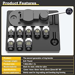 Ring Bending Tool Set: Our ring making kit includes 6 nylon dies, 6 iron dies and important tools such as a ring measuring tool Precision Crafting: Regarding the hardness of the metal, we recommend this ring maker for soft metals or light metals less than 3mm thick. You can also use this machine to make spoon rings Superior Performanc: The ring bender is made of solid steel which has been hardened to 45-50 HRC. Each steel pin and die are black oxidized and there is no risk of corrosion throughout its service life Heavy Duty And Multifunctional: This bending kit is ideal for home crafting, jewelry stores, DIY projects, and repairs, jewelry making ring bender novices and hobbyists. The spoon ring bending set is durable and the dies are available in different sizes to fit different ring and earring designs Extensive Accessories: The ring maker provides nylon dies that allow you to perform bends without damaging delicate materials. The sizing tool is also very practical and accurate to ensure your ring is the perfect size
