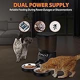 Feed Two Cats: The automatic cat feeder is perfect for two pets. It features a unique meal divider that ensures an even distribution of food, preventing any potential conflicts between the two cats during mealtime, perfect for long weekends and short business trips, providing you with peace of mind for 2 happy and well-fed pets. Clog-free & High-Capacity Food Storage: With a generous 6L transparen food storage with a scheduled arrange 2 pets' feeding for 2-3 weeks at the same time. Plenty of storage space reduces the need for frequent refills, and transparent granary lets you observe the grain levels in real time, ensuring you know precisely when it's time for a refill. Voice Record Meal Call: Record up to 10 seconds of your voice for mealtime calls. Let your cat and dog hear your voice when it’s mealtime to create a strong bond and set good eating habits. (Manual Feeding Function: Press the "Feed" button to give your pet extra rewards) Personalized recording of timed cat feeder makes your pet feel safer! Reliable Backup & Unleash the Outdoors: Say goodbye to worries about power outages! Automatic pet feeder is wall-powered and/or battery-powered. 3 D-size batteries (not included) provide the necessary backup power. Your pet will stay well-fed even during power outages and you to place it outdoors as well. Whether it's your energetic dog or other outdoor pets, they can now enjoy scheduled feedings without any hassle. Secure Sliding Lock Lid Storage: Storage container comes equipped with a convenient sliding lock lid, ensuring a tight seal to preserve the freshness and crunchiness of your pet's food and secure from any poaches. With the included desiccant, the pet feeder keeps food fresh and delicious for every meal.