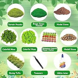 Miniature Basing Material Set: This set contains all the basic materials needed to create miniature models - from 40ml white latex, tweezers to light green and yellow-green evergreen moss, grass green and yellow-green grass powder, etc., a box of static grass, 5 widths of miniature flower clusters of different colors, and two types of sand and stone, which can easily create realistic miniature scenes. A must-have for model lovers! Diorama Supplies Realism and Details: Made of high-quality materials to ensure that every detail is lifelike. A rich combination of accessories, including miniature flower clusters of different colors and widths and two types of sand and stone, adds natural beauty and personality to your work. Easy to Use: Even novices can easily get started, quickly master the skills through simple and easy-to-understand operation steps, and create professional-level miniature scenes. It is especially suitable for model lovers who want to improve their skills. Versatile Application: Suitable for a variety of miniature scene constructions, such as war games, sand table model making, diorama scenes, etc., providing a wide range of creative space, achieving multi-purpose use, and extremely cost-effective. Terrain Model Kit: One set can handle all basic production needs without the need to purchase additional materials. It is cost-saving and convenient, and is ideal for those who pursue efficient creation. Start your journey of miniature model creation!