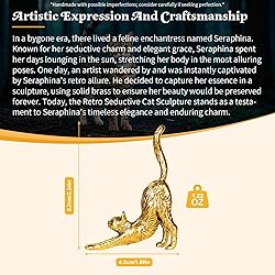 Masterful Craftsmanship: Unveil the elegance of the Retro Seductive Cat Sculpture, frozen in a moment of graceful stretching, crafted from solid 100% brass. Whimsical Charm: Each curve and line of the cat's body is meticulously crafted, revealing the artist's deep understanding of feline grace. Collectible Delight: This isn't just a cat; it's an artwork that whispers tales of old-world charm and timeless beauty. Perfect for adding a touch of sophistication to your home, desk, or office, this collectible art piece is a must-have for art lovers. Thoughtful Gift Idea: Imagine a story unfolding: a feline seductress, lounging with lazy grace, inviting you into her world of retro allure. Versatile Display Options: Whether placed on a shelf, in the living room,or on your desk, this cat art piece serves as a delightful focal point, bringingjoy and harmony to your environment.