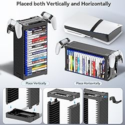 Video Game Storage Tower Holder with Controller Stand, Wall Mount Game Organizers and Storage for Nintendo Switch 2/ PS5/4/ XboxOne/Series, Vertical & Horizontal Stand for 20 Gaming Discs Accessories
