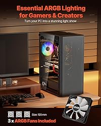 • This case comes with 3 x 120 mm ARGB fans, ensuring excellent cooling performance while creating an immersive gaming atmosphere with vibrant lighting effects. Made of SPCC steel and tempered glass, it is compatible with ATX motherboards and supports up to 4 hard disks.