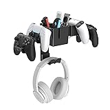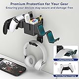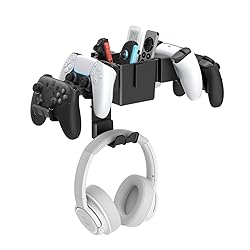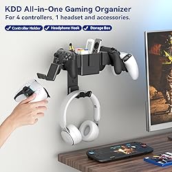 All-in-One Gaming Organizer – Our wall mounted controller and headset holder stores up to 4 controllers, 1 headset, plus small gaming accessories in one place. Keep your desk clutter-free and create a clean, professional gaming setup Durable & Scratch-Free – The game controller holder built with sturdy metal and ABS for long-lasting use. Each hook is lined with soft silicone pads to protect your valuable controllers and headphones from slips, scratches, and damage Storage Box with Dividers – Top storage tray of this dual controller stand holder includes divided sections for phones, game cards, charging cables, or other essentials. Controller stand supports up to 5 lbs, while the headphone hanger holds up to 3 lbs safely Universal Compatibility – Our gamepad headset hanger fits Xbox Series X/S controllers, PlayStation 3/4/5, Switch Pro, Steam, and most PC gamepads. Headset hook accommodates all headphone types and sizes, making it a versatile gaming rack Ideal Gift for Gamers – A must-have gaming accessory for bedrooms, dorms, and game rooms. Perfect as a birthday, holiday, or Christmas gift for men, teens, or any gamer who wants a tidy and organized setup