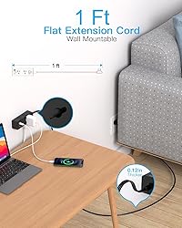 【Ultra Flat Plug Power Strip & 1 Ft Flat Extension Cord】With only 0.35 inch ultra thin plug and 45 degree right angle design, One Beat low profile flat wall plug is mush slimmer than traditional plugs, can close to the wall easily and hide in the back of furniture, bed or refrigerator, no waste for outlet and space. 1 ft extension cord with only 3mm thicker which is made of pure copper, which has better current carrying capacity (15A) 【9-in-1 Extension Cord with Multiple Outlets】Flat power strip could turn 1 sockets into 6 AC outlets 2 USB-A and 1 USB-C, which could charge up to 9 devices at the same time. The USB C port can charge up to 5V/3A. 2 USB-A ports can charge up to 5V/2.4A Max, all USB Ports Output is 5V/4.5A, compatible with your cellphone, laptop, tablet, earphone or cameras without a variety of converters. 【Surge Protector Power Strip】The electric strip has a 900-Joule energy rating providing a reliable power extension cord to protect your devices and appliances: TV, printers, computer. It secures your electronic devices from overload, short circuit, power spikes, lightning strikes, or fluctuations. (The "SURGE PROTECTED" soft indicator light on to show your devices are protected). 【Flat Wall Adapter & Desktop Power Strip with USB Ports】 The two mounting holes on back allows this power strip to be securely installed in various applications, save your space and make your desktop organized. 【Space Saving & Travel Ready】3-side design and each AC outlets with 1.6 inches space in between, larger than standard 1.5-inch socket, fit big adapters without blocking each other. The compact size (5.0*1.9*1.8 IN) takes up less space on your desk or luggage, a must have accessories for travel, colleague dorm room, home, office, bedroom, kitchen and etc.