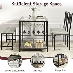 4 EVER WINNER Dining Table Set for 4, 55" Kitchen Table Set with Storage Shelf, Wine Rack & Wine Glasses Holder, Breakfast Table Set for 4 with Chairs and Bench for Dining Room, Kitchen, Wash Grey