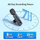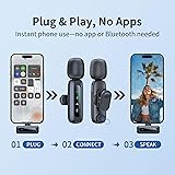 Upgraded Smart Display: The podcast microphone is equipped with four LED indicators for pairing, mute, noise reduction and battery status. The LED display makes the function operation easier to control and adjust, allowing you to enjoy a more convenient user experience Easy to Connect: Our phone microphones are very easy to use. Plug and Play. No Bluetooth, No messy cables or app needed, simply plug the receiver into your device, and it can charge your phone anytime during use(NOTE: The receiver doesn't need to be charged.) Omnidirectional Sound & Noise Cancellation: This wireless microphone for android is equipped with the newest technology, 360° omnidirectional sound pickup, ensuring clear sound quality and stable audio transmission with minimal interference 14H Battery Life & 65ft Range: With built-in rechargeable battery and low-power chip, a single microphone can run for up to 7 hours. You can use two microphones for up to 14 hours when alternating. The maximum effective distance of the mic for iphone reaches up to 65 fee Wide Compatibility: The wireless mic is equipped with a USB-C receiver, which can be easily connected to iPhone 15/16, Samsung and other Android devices; it comes with a USB-C to Lightning adapter to support iPhone 7-14, iPad, etc. Note: A few Android models may require enabling the "OTG" function in settings before pairing