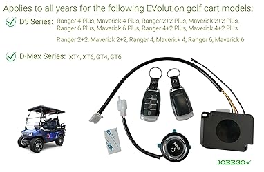 - Perfect FitThe JOEEGO Power Push Button Start System fits for EVolution EV golf cart, work on 48 volts golf carts, compatible with D5 series: Ranger 2+2, Ranger 4 & 6, Maverick 2+2, Maverick 4 & 6, D5 PLUS & D-Max series, replaces OEM# 2.04.1175.High Quality & Easy InstallHigh quality golf cart parts & installation following packed replacement manual: the illustrated step by step instructions provide a clear and detailed guide to ensure the installation is completed successfully.Package Includes1 x module with wiring 1 x start button with wiring 1 x double side tape 2 x remote keys