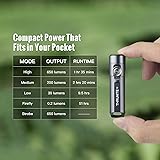 Blazing Brightness in Your Pocket – Harness up to 650 lumens of output and 105 meters of beam distance from a compact high-performance LED light—perfect for everyday carry, outdoor adventures, or emergency use Convenient USB-C Charging – Features a built-in 350mAh rechargeable battery and a USB-C port for fast, modern charging. Charging status is clearly displayed with red and green LED indicators Hands-Free Utility & Easy Carry – Use the magnetic tailcap to stick it onto metal surfaces, or carry it on your keychain or clip it to your pocket with the included hardware—built for flexible everyday use Multiple Light Settings for Any Task – Easily switch between Firefly (0.2 lm), Low (30 lm), Medium (200 lm), High (650 lm), and Strobe. One-click for standard use, triple-click for strobe—quick and intuitive Minimal Size, Maximum Portability – Weighing just 26.5g and measuring only 60.8mm long, this ultra-slim flashlight fits comfortably in your hand, pocket, or gear bag Built Tough for Real Life – Precision-machined from aerospace-grade 6061-T6 aluminum with a rugged Type III hard-anodized finish. Fully waterproof to 2 meters (IPX-6) and impact-resistant up to 1.5 meters