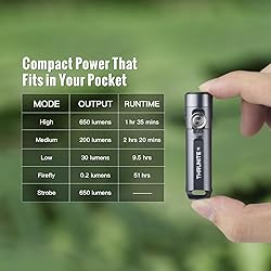 - Product Description: The ThruNite Ti keychain flashlight combines everyday convenience with professional-grade performance. Delivering up to 650 lumens with a max beam distance of 105 meters, this mini flashlight is powered by a built-in rechargeable 350mAh battery and features a USB-C port for fast, convenient charging. With five lighting modes (including Firefly and Strobe), the Ti adapts to your needs—whether it's for camping, emergency use, or daily tasks. The magnetic tailcap allows hands-free lighting, and the included keyring and clip make it a perfect companion for your pocket, bag, or keychain. Built from AL 6061-T6 aluminum with a Type III hard-anodized finish, it is both impact resistant up to 1.5 meters and IPX-6 waterproof (2 meters). At just 26.5g and 60.8mm long, it's small in size but big on performance. Includes a USB-C cable, keyring, rubber cover, and more—everything you need to light your path wherever you go.